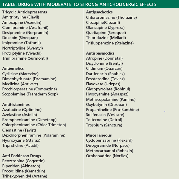 While the classic anticholinergic problems of decreased secretions slowed gastrointestinal motility blurred vision increased heart rate heat intolerance sedation and possibly mild confusion may be uncomfortable for a younger patient in relatively good health these effects can be disastrous for older patients.